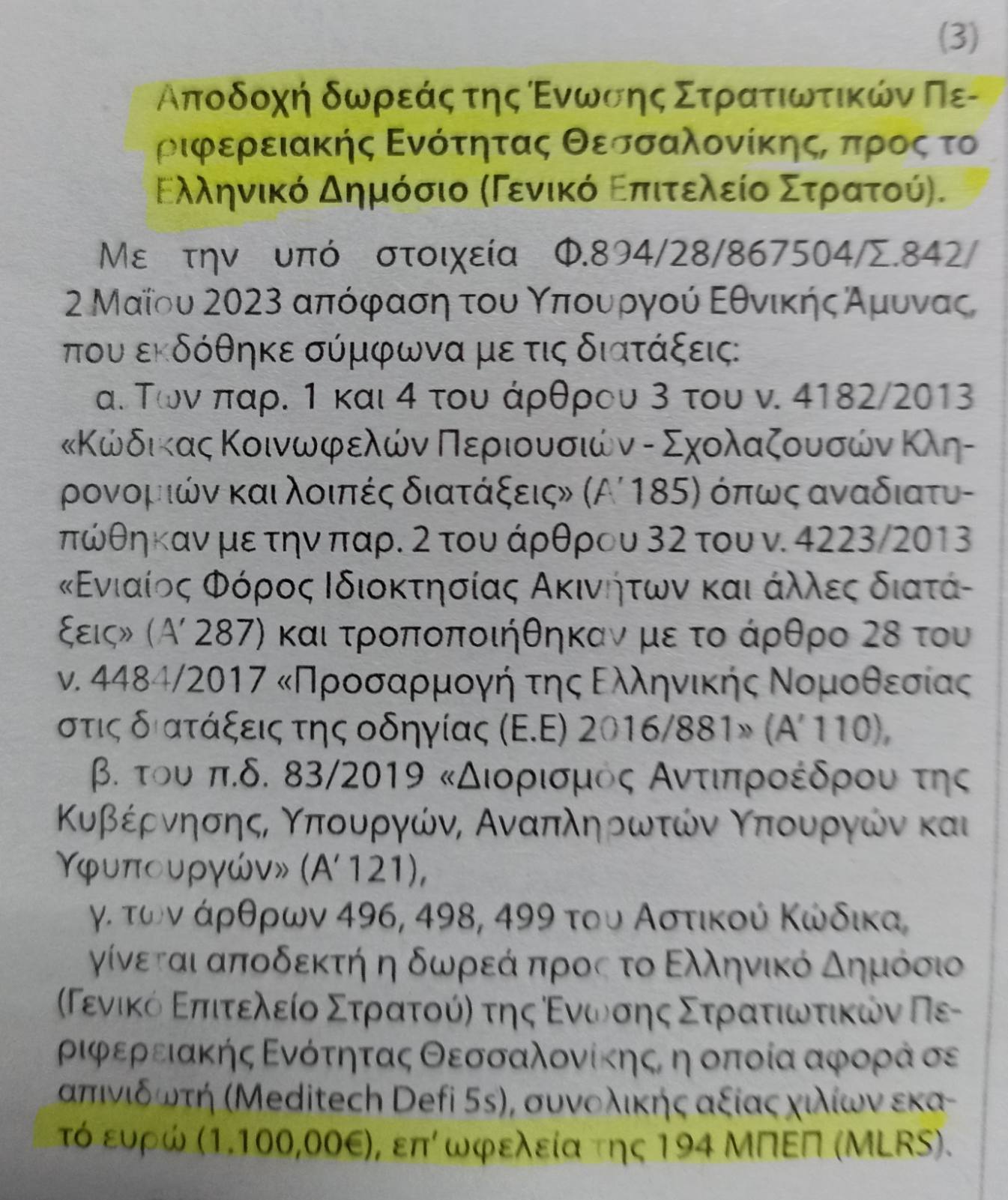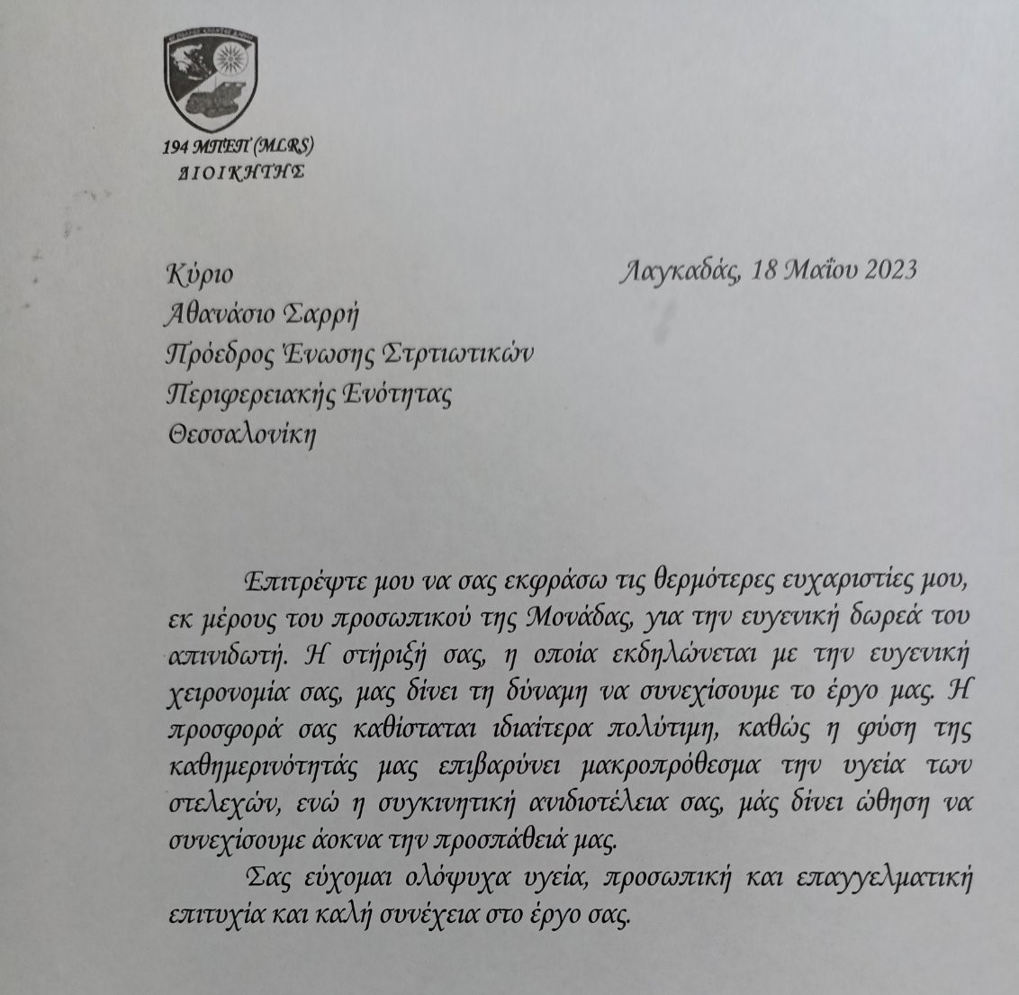 Η Ε.Σ.ΠΕ.Ε. Θεσσαλονίκης μετα από απόφαση του διοικητικού συμβουλίου της παρέδωσε για χρήση επ΄ωφελεια των στελεχών της 194 Μ.ΠΕΠ (MLRS) έναν υπερσύγχρονο αυτόματο απινιδωτή Meditech Defi 5s συνολικής αξίας 1.100 ευρώ .