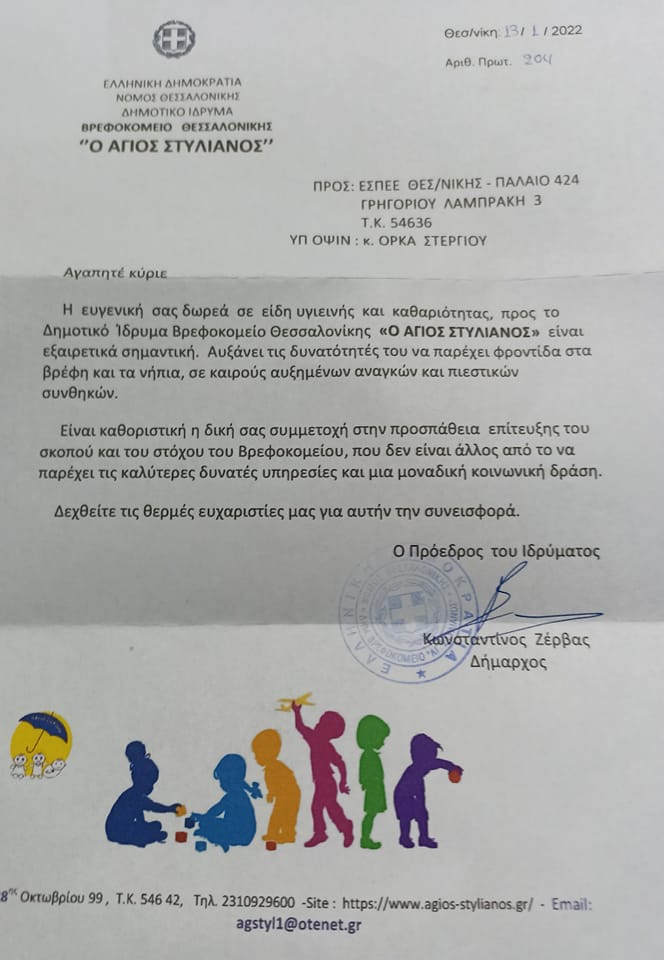 ΔΩΡΕΑ ΕΙΔΩΝ ΠΡΩΤΗΣ ΑΝΑΓΚΗΣ ΣΤΟ ΔΗΜΟΤΙΚΟ ΒΡΕΦΟΚΟΜΕΙΟ ¨ΑΓΙΟΣ ΣΤΥΛΙΑΝΟΣ¨