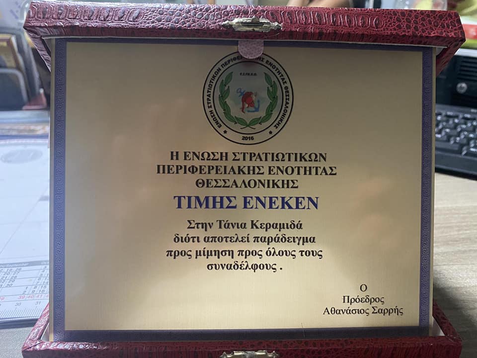 Η Λοχίας Τάνια Κεραμιδά είναι ε.ε. συνάδελφος , πάσχει από μια σπάνια αυτοάνοση νευρολογική νόσο (ΜΥΑΣΘΕΝΕΙΑ GRAVIS) ,μια ασθένεια που την οδήγησε σε ένα πολύ σοβαρό χειρουργείο (2017) , πολλές συχνές νοσηλείες στο νοσοκομείο και της έχει προκαλέσει σοβαρές λειτουργικές διαταραχές (προβλήματα όρασης , κινητικές διαταραχές , αναπνευστικές δυσκολίες ) , παρόλα αυτά δεν το έβαλε κάτω και αποφάσισε να ενταχθεί ως αθλήτρια στίβου στον Σύλλογο ΑμεΑ Ελπίδα Θεσσαλονίκης (2020) μη θέλοντας να υποκύψει στα προβλήματα και επιθυμώντας να αντιμετωπίσει τη ζωή με διαφορετικό τρόπο , παράλληλα δραστηριοποιείται και ως έφορος στο τμήμα Στίβου του ΠΑΟΚ .