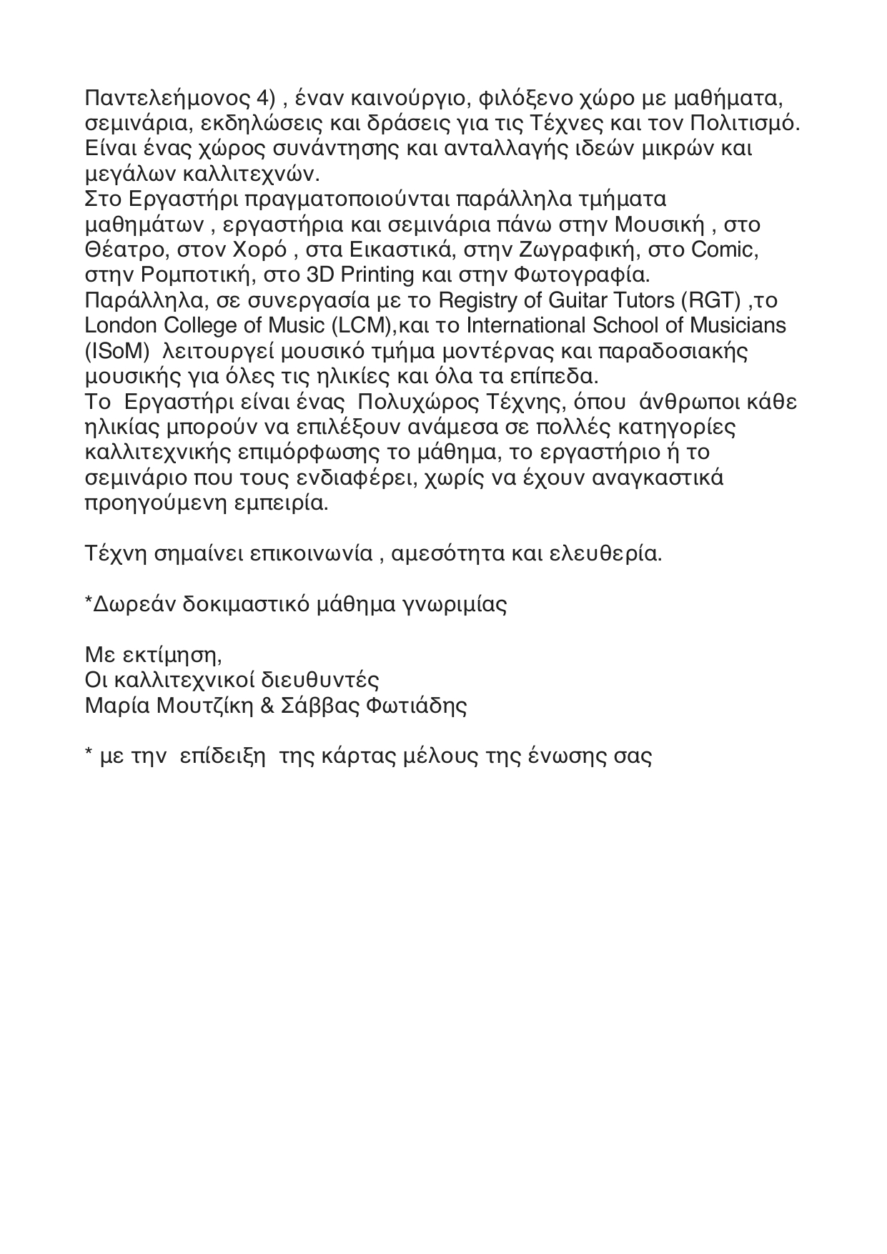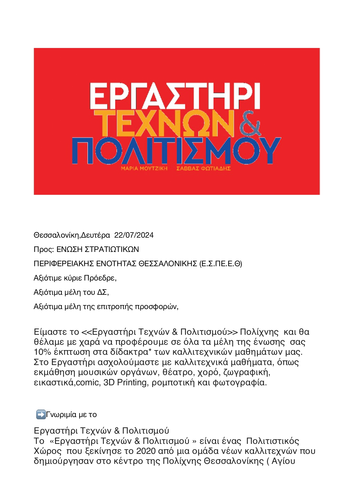 ΠΡΟΣΦΟΡΑ ΕΡΓΑΣΤΗΡΙ ΤΕΧΝΩΝ ΚΑΙ ΠΟΛΙΤΙΣΜΟΥ